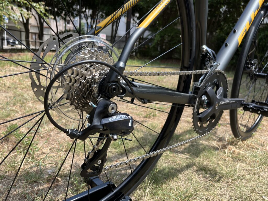 ドライブトレインはシマノSORAの9s、カセットもシマノのHG400の11-28t。クランクはFSAの3ピースなのでまだまだ軽量化の余地はありそう。