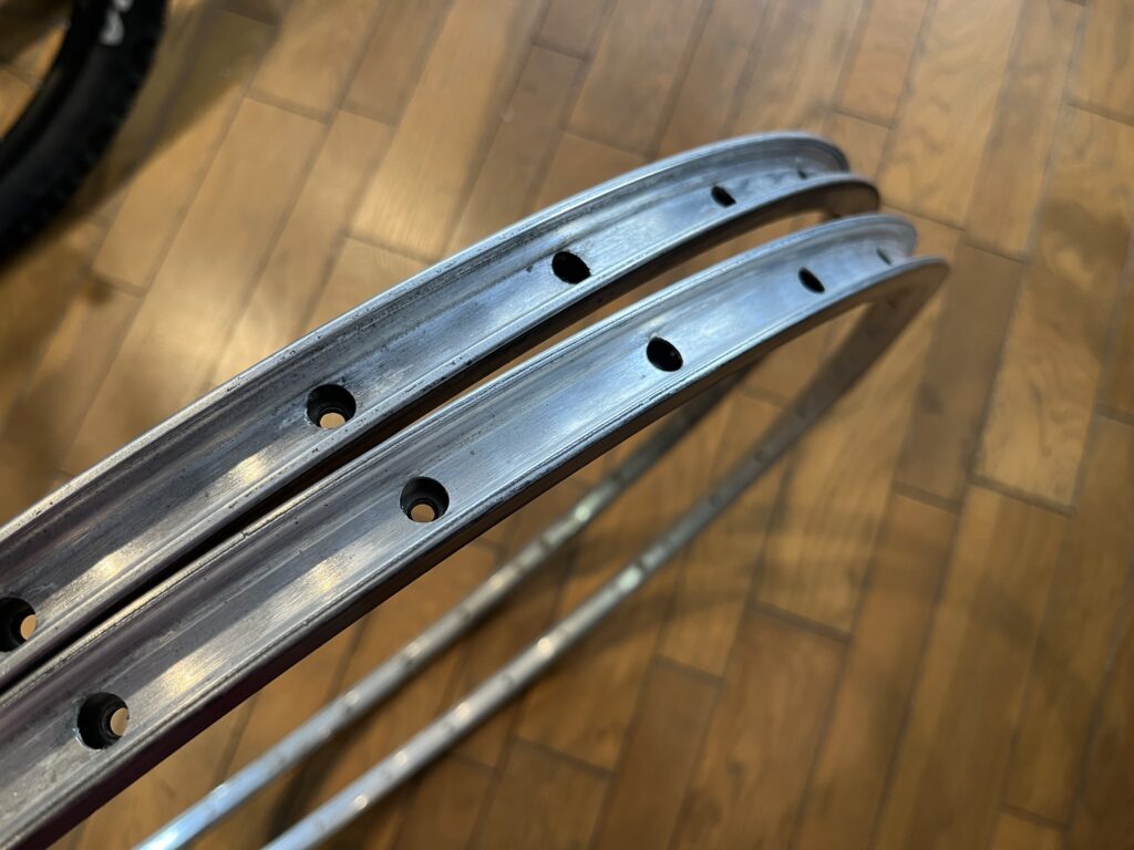 元のリムよりも僅かにハイトが高くなったのでリア用に新しいリムを使い、変形のなかった旧リアリムはフロントに移植しました。